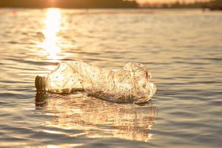 Used plastic bottle floats on the surface of the water. Sunset, green trees. People and ecology. Riverside pollution. Preservation of nature. Volunteering concept. Close-up shot.