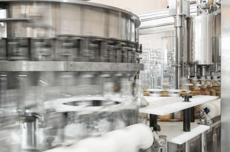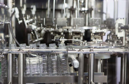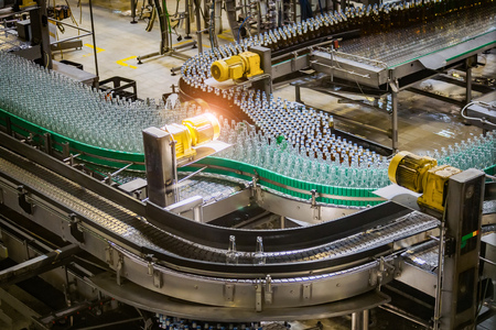 Beverage factory interior. Conveyor flowing with bottles for juice or water.