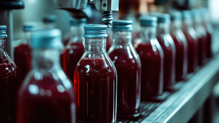 This image showcases the bottling process of dark red juice in an industrial setting, highlighting automated machinery and glass containers on a production line.