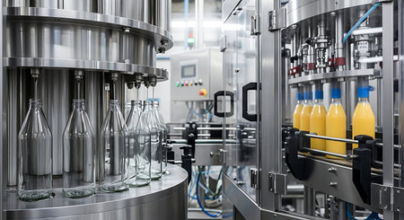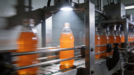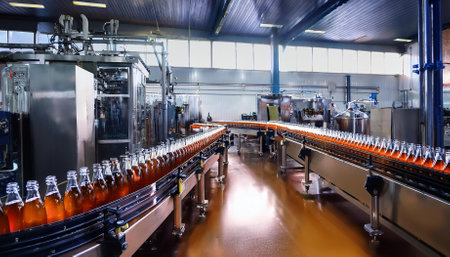 Photo of an automated bottling line in a beverage factory, capturing the speed and efficiency of food and drink manufacturing,