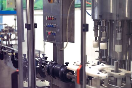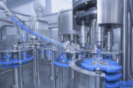 Blurred image of Modern Water filtration system and electronic control panel and tank at Water factory.Close Up of water bottles,water bottling line in equipment at the Water factory.