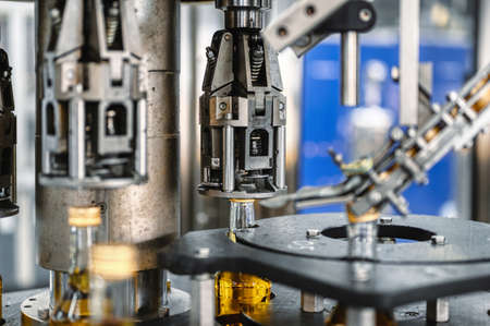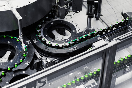 Beverage filling process equipment at beverage plant pouring refreshing drinks into glass bottles