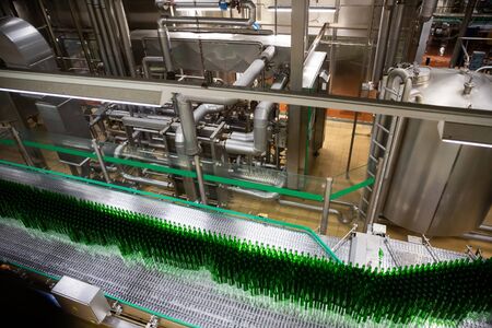 Automated conveyor line in a brewery. Rows of green glass bottles on a conveyor belt. Industrial brewery