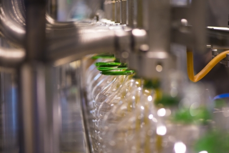 Conveyor with bottles for juice or water. Beverages factory equipments