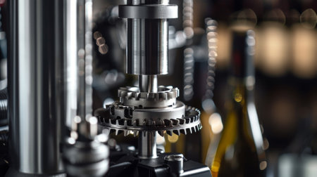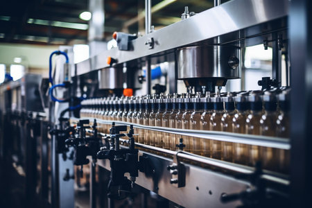 Close-up of beverage production line with industrial equipment. Generative AI.
