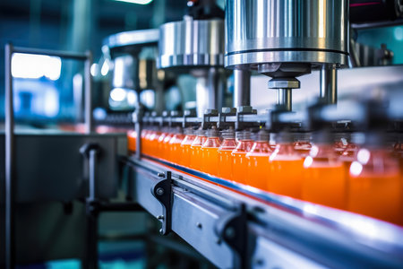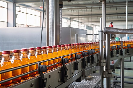 Conveyor belt , Beverage factory of fruit juice product for processing and bottling , Generative Ai Technology