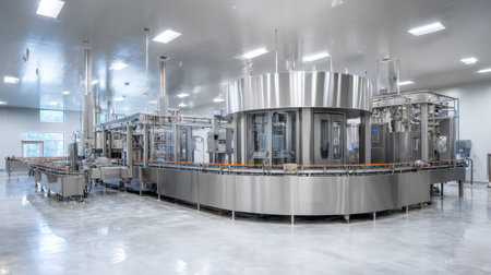 A spacious and modern industrial factory featuring advanced machinery for automated production. The clean room environment highlights efficiency and precision in manufacturing processes.