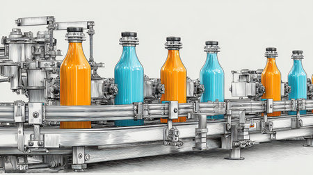 A vibrant illustration showcasing bottles in orange, blue, and green on a production line in a factory. This image highlights modern machinery and manufacturing processes.