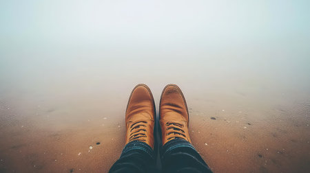 A pair of stylish brown leather shoes rests on sandy beach while gentle fog envelops the scene, creating a perfect atmosphere for calming reflections and peace.