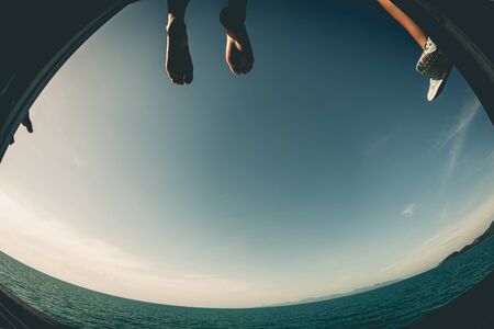 The tourist feet on deck boat background sea for freedom concept.