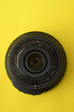 Kharkov, Ukraine - March 7, 2021: Canon lens cup close-up on yellow background