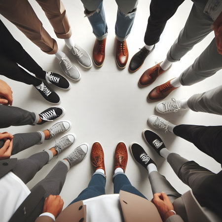 A large group of diverse people stand in a perfect circle on a cobblestone street wearing colorful sneakers and boots to symbolize community connection and united teamwork collaboration.