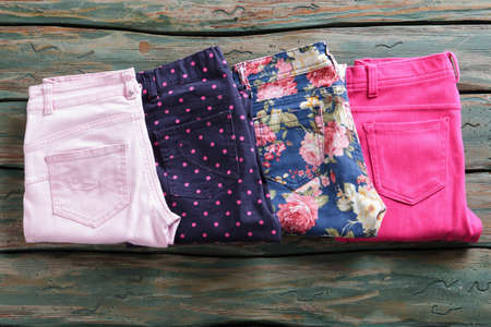 Overhead view of arranged jeans and trousers in various shades on a wooden floor