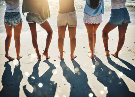 Time to get our feet wet. a group of girlfriends standing together on the beach.