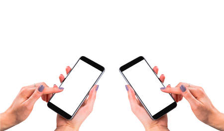Beautiful Woman hands holding the smart phone with isolated white screen. Business workplace with copy space. Empty space for text. Isolated screen for mock up. Left and right hand