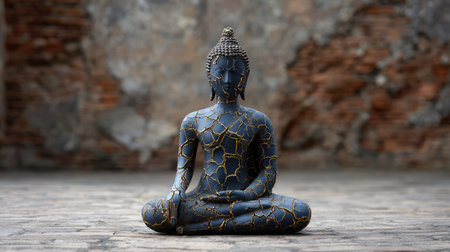 This striking blue Buddha statue with cracks showcases unique artistry, evoking a sense of peace and tranquility against a rustic brick background, perfect for spiritual themes.