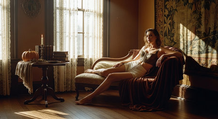 Beautiful woman wearing lingerie sitting on bed in vintage room