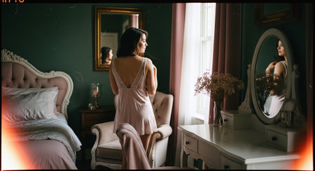 Natural radiance woman with freckles and natural curls wearing lightweight lingerie set captures moment