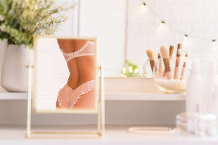 Reflection in table mirror of woman body in underwear. Female party preparation. Сhristmas, light bulbs, eucalyptus, fir, pine branches in a vase on dressing table with make up accessories.