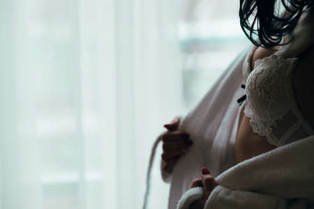 Sensuality allure. Woman in white lace lingerie, standing at window, taking off bathrobe.