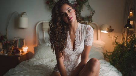 Sensual woman wearing lingerie relaxing on bed in romantic bedroom