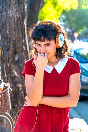 A beautiful woman in a red dress listening to music on her headphones in an urban environment.