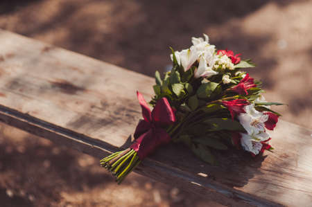 Wedding background. Bouquet from rose flowers on grass. Bridal floral decoration detail outdoors in summer park, copy space