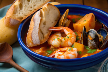 Bouillabaisse in a blue ceramic bowl with slices of baguette and shrimp on the side, AI Generated