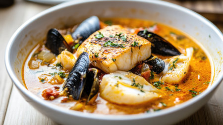 A mouthwatering shot of traditional French bouillabaisse, showcasing cod fish and mussels in a rich red wine tomato sauce,