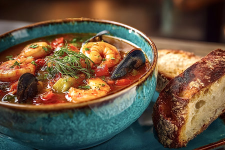 Turquoise bowl full of fresh hot seafood stew with shrimps and mussels, decorated with dill and accompanied by toasted slices of bread, offers a flavorful and comforting meal