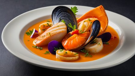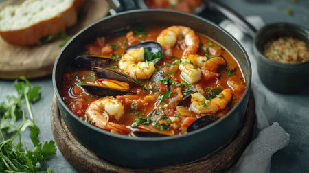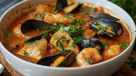 Classic bouillabaisse soup with fish, mussels, and shrimp, garnished with parsley