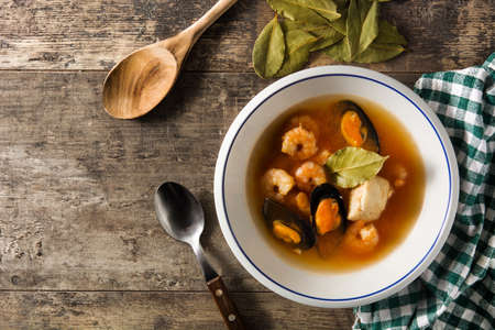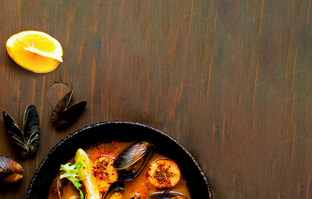French bouillabaisse soup on wooden table. Top view Copy space