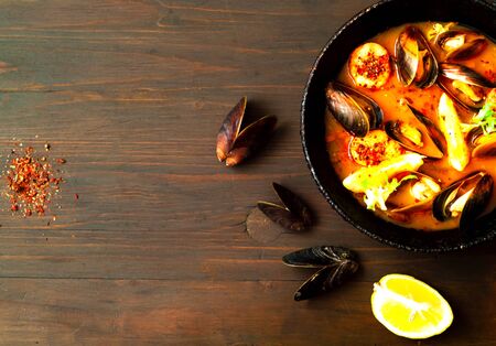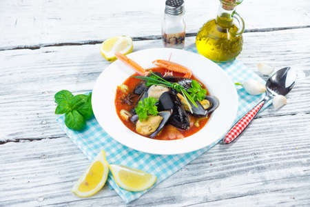 Seafood soup bouillabaisse. Mussels and shrimp in tomato sauce. The traditional dish of Marseilles. He served in France, Italian, Spain. Rustic style.
