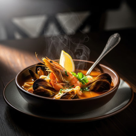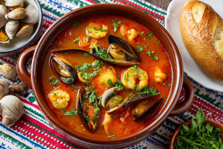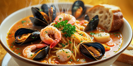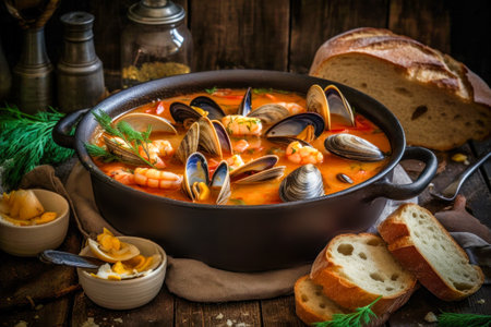 Steaming hot bouillabaisse soup with fish, mussels, and shrimp, served with bread