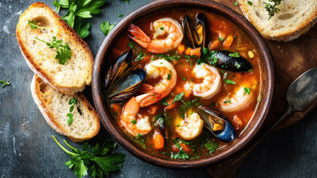 A stunning top-down view of a bowl of bouillabaisse, featuring vibrant seafood and vegetables in a flavorful broth, beautifully presented with a sprinkle of herbs and a side of garlic toast.