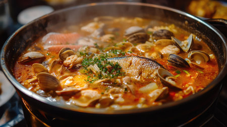 A close-up view of a bubbling seafood stew in a saucepan, showcasing an array of colorful seafood like clams, fish, and vegetables, simmering in a savory broth, inviting for a cozy meal.