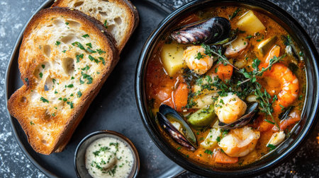 A delicious overhead view of bouillabaisse, brimming with fresh seafood and vegetables in a rich broth, elegantly garnished with herbs and served with a side of garlic toast,