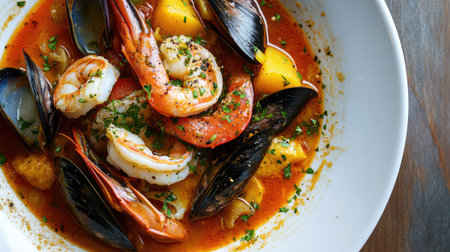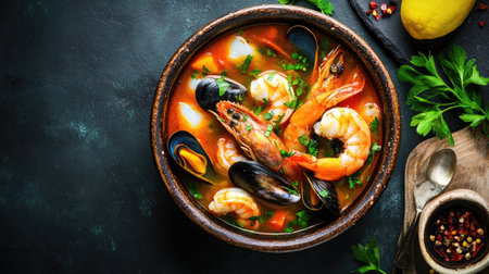 Top view of a Cioppino seafood stew in a bowl, featuring shrimp and mussels. Rich broth and fresh seafood. Perfect for gourmet food photography with space for text.