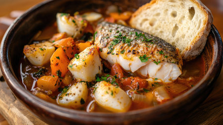 A warm presentation of bouillabaisse in a rustic bowl, filled with tender fish, succulent shellfish, and a fragrant broth, accompanied by a slice of crusty bread for a delightful Mediterranean meal.