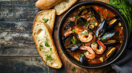 An inviting top view of bouillabaisse filled with colorful seafood and mussels, beautifully styled with a side of crunchy garlic toast baguette for an appetizing meal.