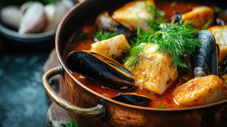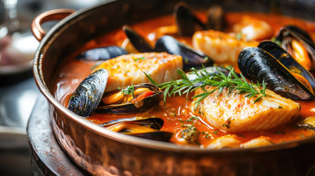 Close-up of a rustic copper casserole filled with vibrant seafood bouillabaisse, showcasing cod fish and mussels immersed in a savory red wine tomato sauce, garnished with fresh herbs.