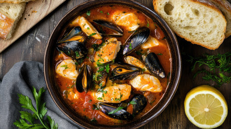 A warm and inviting top view of a bowl of bouillabaisse, filled with fresh fish, mussels, and herbs in a savory broth, elegantly styled with lemon slices and served with crusty bread for a classic touch.