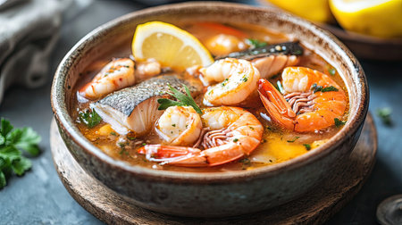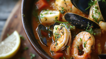 A vibrant seafood stew featuring shrimp and mussels, garnished with fresh herbs and a slice of lemon, served in a rustic bowl. Perfect for culinary inspiration.