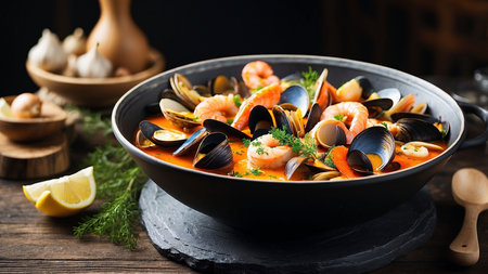 seafood soup with fish and blue mussels in bowl