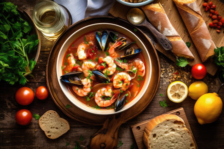 A colorful top view of bouillabaisse soup, featuring a bounty of seafood like shrimp, mussels, and scallops, presented in a rustic bowl, with crusty bread
