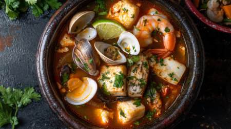 Top-down view of a seafood soup bowl, filled with fresh clams, shrimp, and fish fillets in a rich broth, garnished with coriander and lime.