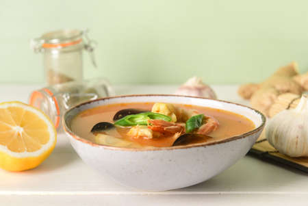 Bowl of spicy Thai soup on table