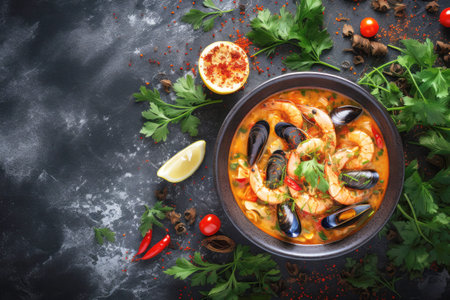 A mouthwatering top-down view of bouillabaisse soup, highlighting a mix of seafood in a fragrant broth, presented in a deep bowl surrounded by vibrant garnishes for a colorful dining experience.