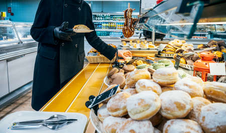 Paris, France - Dec 9, 2017: Side view of an elegant woman in black coat taking from the food court inside IKEA furniture restaurant a delicious cake