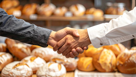 Two hands clasped in a handshake, one in a dark long-sleeved shirt and the other in a white shirt, with shelves of golden-brown baked bread in the...